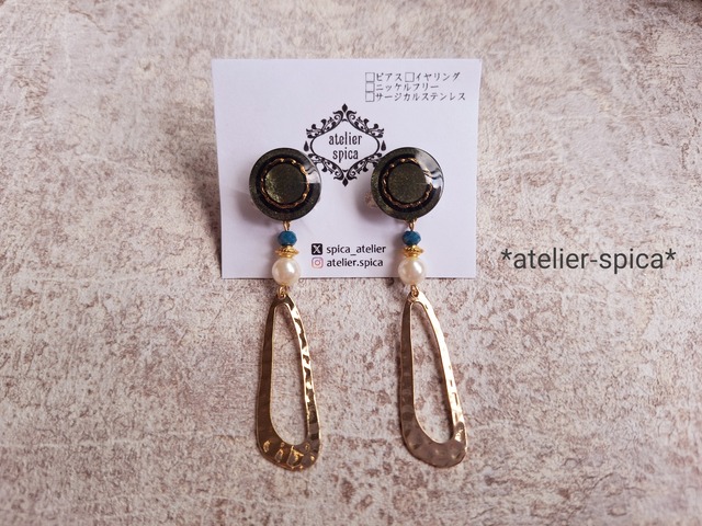 ヴィンテージボタンの耳飾りです✨ 一点ものです✨ ピアス、イヤリング金具を選択して下さい。 ピアスの場合は下向き防止キャッチもお付け致します✨ 発送方法(送料)もレターパックライト(追跡あり)、定形外郵便(追跡なし)からお選び下さい。 ご不明な点はご購入前にお問い合わせ下さいませ。 出来るだけ実物に近いお色みを撮影しておりますが、多少の違いはご了承下さいませ。 ボタン約18mm(クリア・ブロンズマーブル) たて約7cm よこ約2.2cm(最大部分のサイズ) ムーンゴールドコネクター ゴールドビーズ フラワーコネクター ドロップ型マーブルビーズ 使用